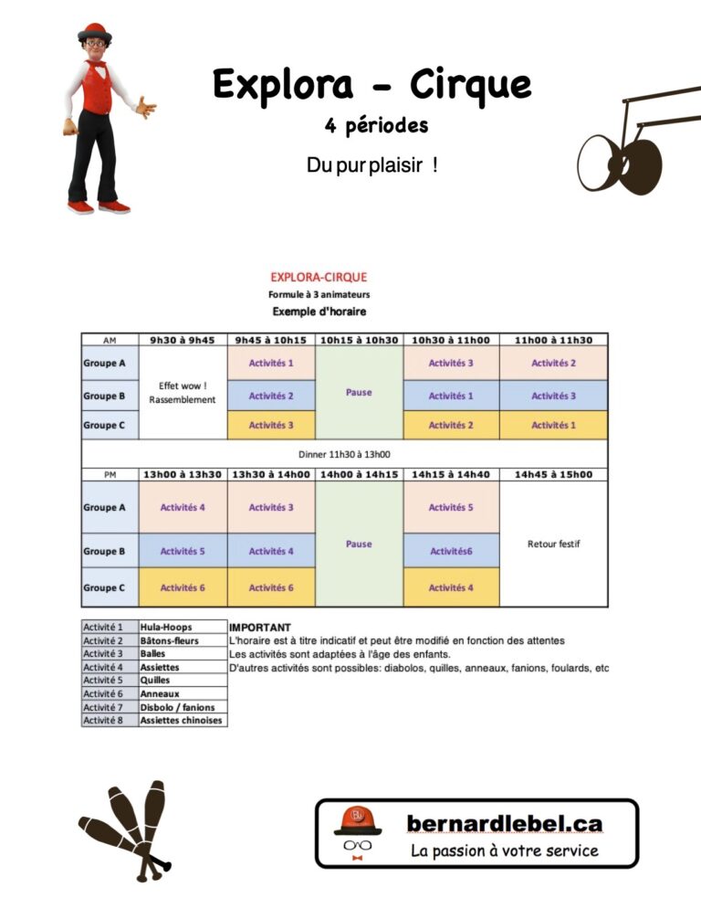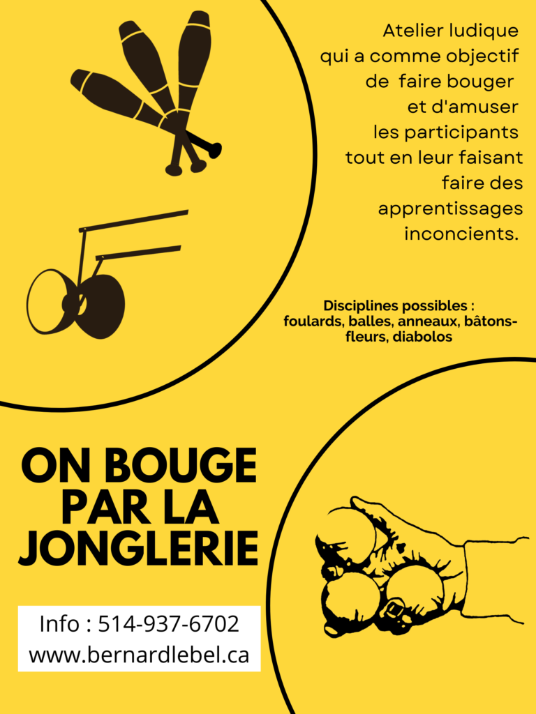Parce que chaque groupe est unique. Que ce soit pour une activité ponctuelle ou une série d’ateliers, nous développons une approche personnalisée pour créer un moment ludique, formateur, rassembleur et mémorable. Jonglerie, équilibre, jeu clownesque, magie, expression corporelle… tout peut être intégré, selon vos envies et votre réalité.
