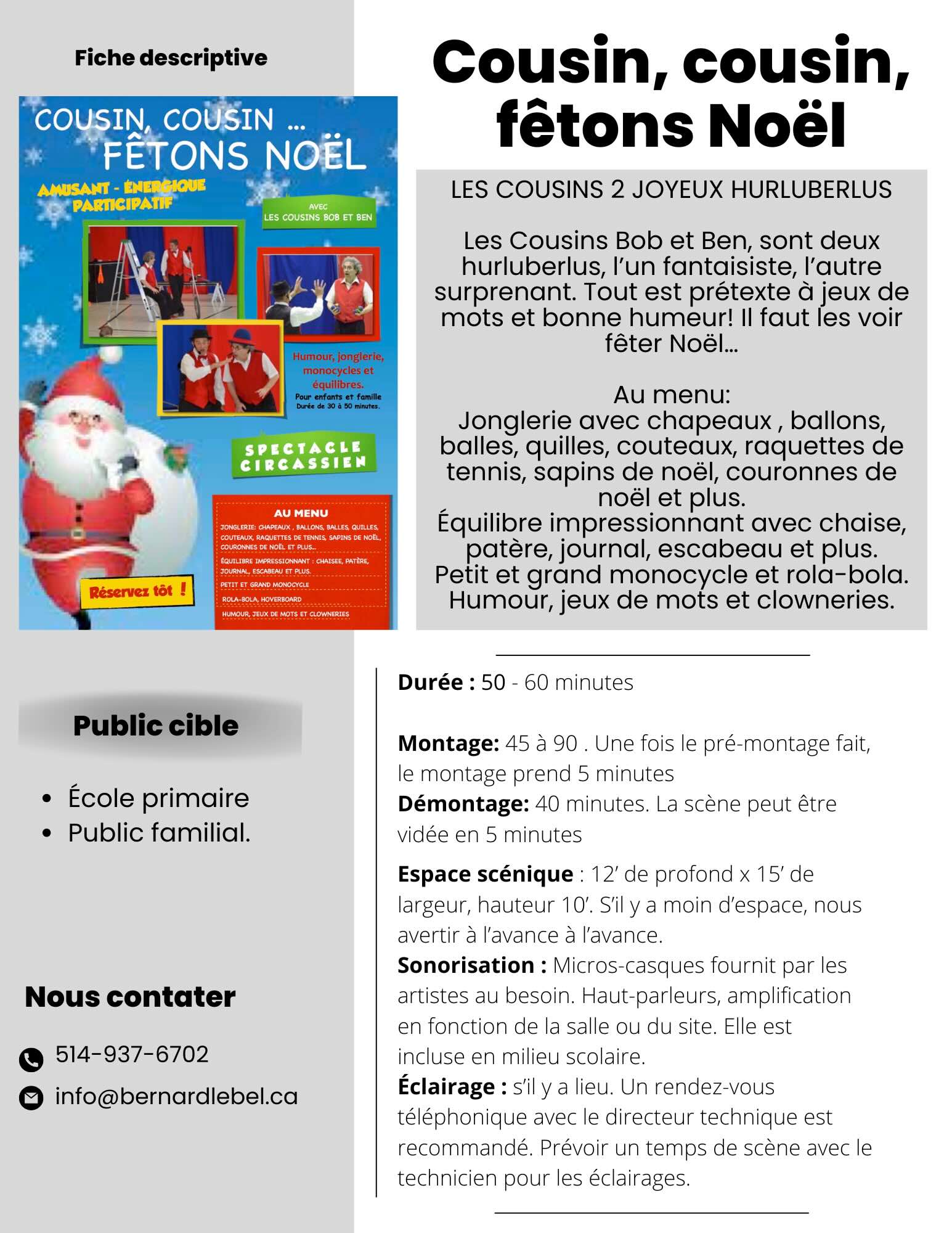 Oups! « Cousin, cousin fêtons Noël » n’ont pas encore de vidéo de leur spectacle de Noël. Ici une petite vidéo du spectacle « Les cousins» duquel est dérivé leur spectacle de Noël « Cousin, cousin fêtons Noël ».