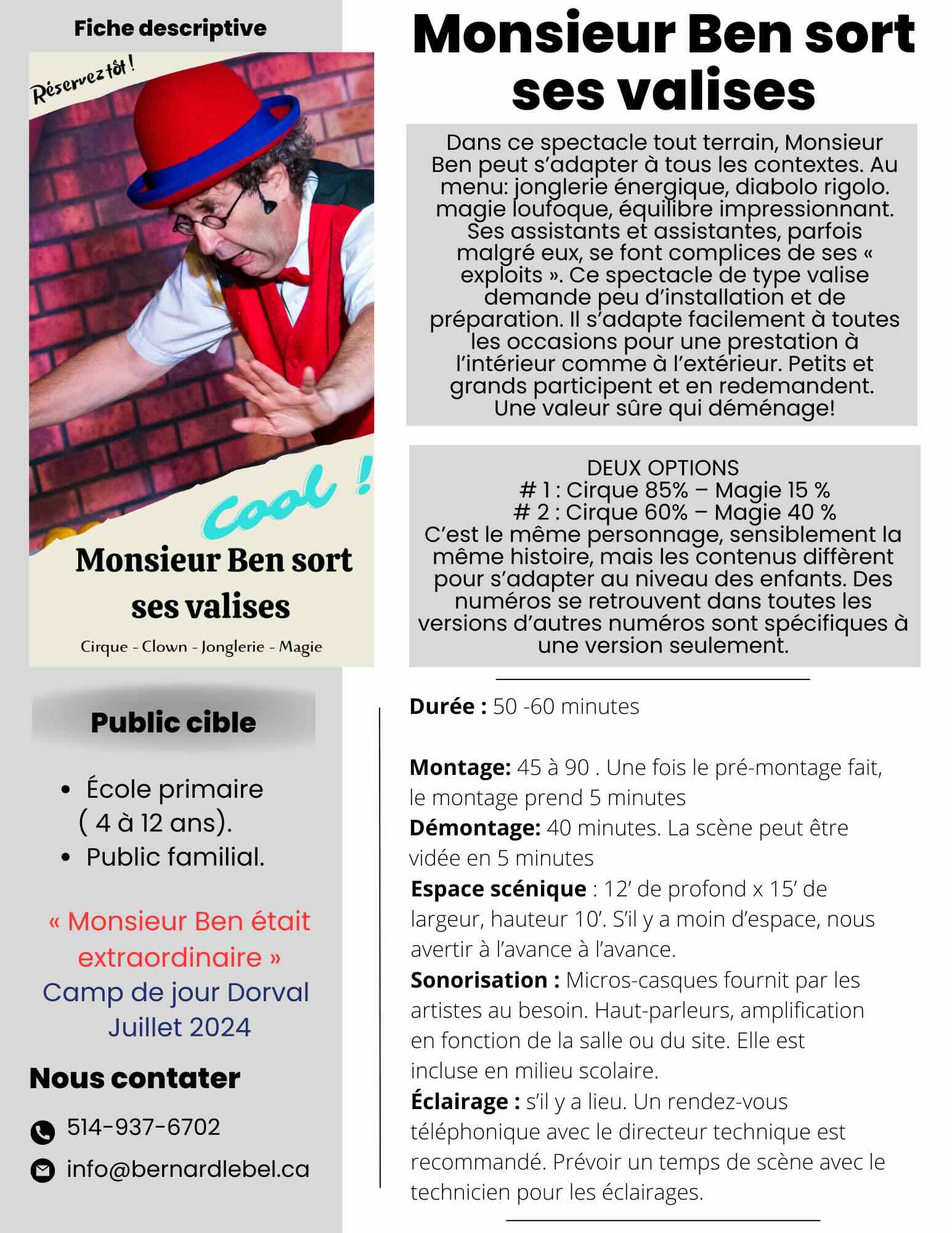 Dans ce spectacle tout terrain, Monsieur Ben peut s’adapter à tous les contextes. Au menu: jonglerie énergique, diabolo rigolo. magie loufoque, équilibre impressionnant. Ses assistants et assistantes, parfois malgré eux, se font complices de ses « exploits ». Ce spectacle de type valise demande peu d’installation et de préparation. Il s’adapte facilement à toutes les occasions pour une prestation à l’intérieur comme à l’extérieur. Petits et grands participent et en redemandent.